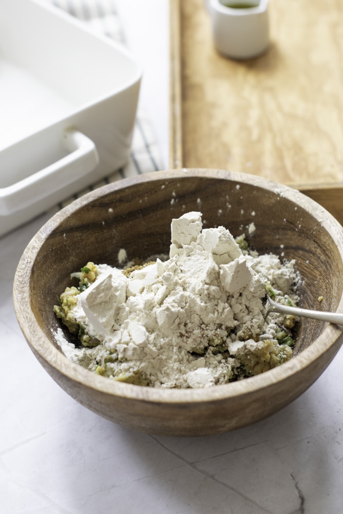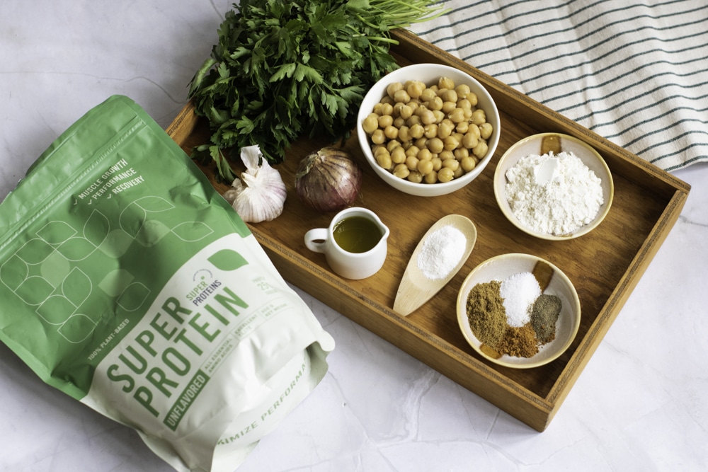 - Transfer the chickpea mixture to a mixing bowl and add the unflavored super proteins protein powder, flour, ground cumin, ground coriander, baking powder, salt, and pepper. Mix well to combine. Add a bit of water if needed.