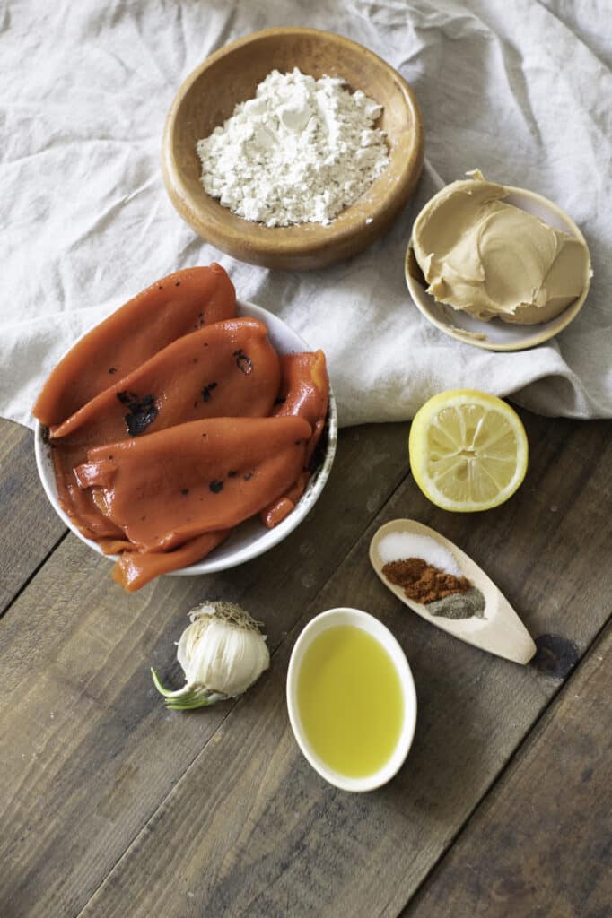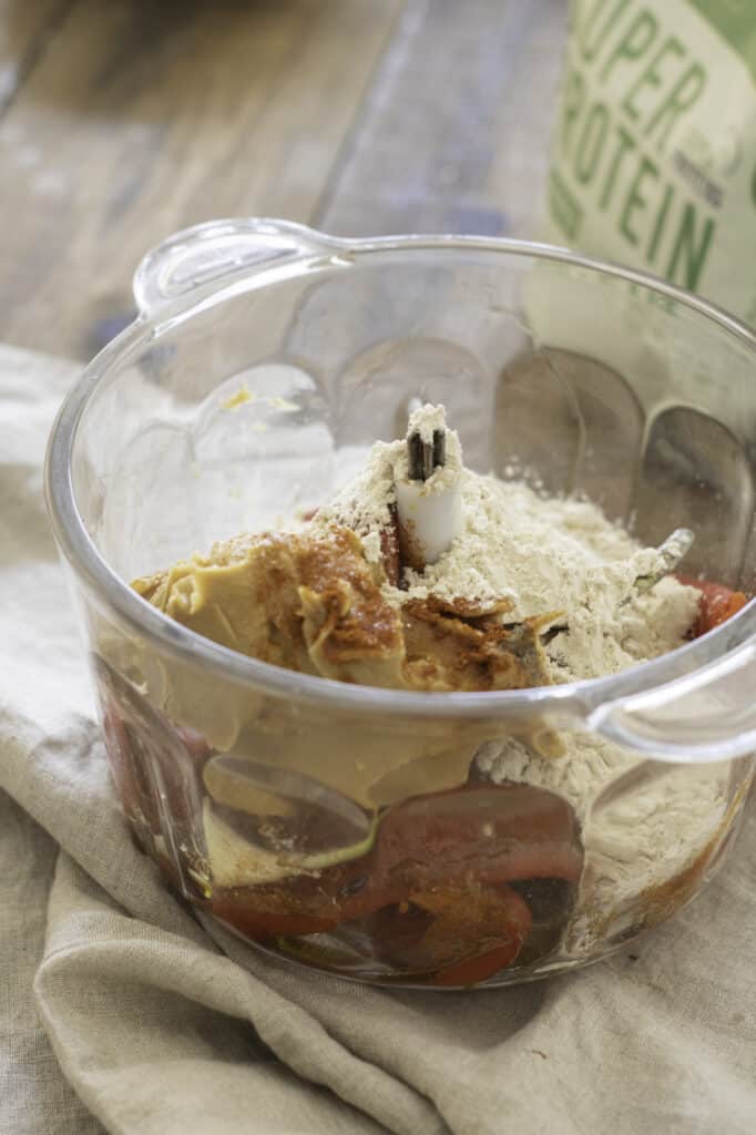 - Blend the Ingredients: In a blender or food processor, combine the garlic, almond butter, lemon juice, black pepper, sea salt, smoked paprika, roasted red peppers, olive oil, and unflavored super protein powder. Blend until smooth and creamy, scraping down the sides as needed to ensure all ingredients are well incorporated.